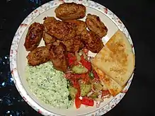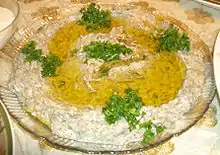Cheese, as well as yogurt and eggs, are commonly used in Lebanon. One of the more recognizable dishes within Lebanon is labneh. Unlike regular yogurt, labneh is strained so as to remove the watery whey, leaving a thicker, creamier consistency. It is spreadable and garnished with olive oil and sea salt.[44] It is an extremely versatile dish that can be served in a mezze platter for either breakfast or dinner. A variant is mixed with garlic.[44] Ejjeh is the traditional omelette of Lebanon.[45] It is made with egg, chopped parsley and scallions. Within Lebanon, people make this omelette with different herbs that are cultivated from their village.[46][47]