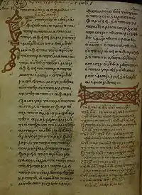 The text is written in Greek minuscule letters, on 112 parchment leaves (26.6 cm by 20 cm), in two columns per page, 27-36 lines per page.[1] The rubricated initial letter for E with right hand making the orthodox sign of the cross.[6] The error of itacism is frequent (especially interchange ε → αι). The nomina sacra are written in an abbreviated way.