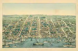 In November 1784, former Lieutenant Colonel (later Major General, Senator, and Governor of Virginia) Henry "Light Horse Harry" Lee III (1756–1818) purchased three one-half acre lots in Alexandria from Baldwin Dade (1716–1783), a merchant. On December 4, 1784, Lee sold one of these tracts to his father-in-law Philip Richard Fendall I, Esq. (1734–1805), for three hundred pounds. Fendall, using enslaved laborers, began building the Lee–Fendall House (for much of its life called the Phillip Fendall House),[4] for his second wife, Elizabeth (Steptoe) Lee (1743–1789), in the spring or early summer of 1785. The lot was located on the Southeast corner of Washington and Oronoco Street, then the edge of the city. At the time, very few structures were near, and the Fendalls had uninterrupted views of Oronoco Bay and the ships which docked there. To the north and west lay verdant fields of grass and clover. Alexandria was an up-and-coming social and political center in Northern Virginia. The architect is unknown, but the style is similar to that found at "Hard Bargain", an estate built by the Digges family, and located in Charles County, Maryland, from which Fendall hailed. It consisted of a "telescopic" design, which was synonymous with Maryland, and had three sections. A plat on a 1796 insurance policy shows eight buildings on the quarter block, valued at a total of $11,500, including an office, a two-story dwelling (probably for enslaved workers), a rabbit house, and a pigeon house. The main dwelling house was valued at $5,000. It is probable the grounds also included a small kitchen and an herb garden.[5]