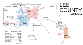 Lee County is a county located in east central Alabama. As of the 2020 census the population was 174,241.[1] The county seat is Opelika,[2] and the largest city is Auburn. The county was established in 1866 and is named for General Robert E. Lee (1807–1870), who served as General in Chief of the Armies of the Confederate States in 1865.[3] Lee County comprises the Auburn-Opelika, AL Metropolitan Statistical Area, which is included in the Columbus-Auburn-Opelika, GA-AL Combined Statistical Area.