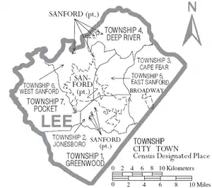 Lee County is a county located in the U.S. state of North Carolina. As of the 2020 census, the population was 63,285.[1] The county seat is Sanford.[2] It was established on March 6, 1907, from parts of Chatham and Moore counties, and named for General Robert E. Lee, who served as the General in Chief of the Armies of the Confederate States in 1865.[3]