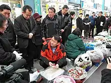 The Grand National Party (GNP) presidential candidate Lee Myung-bak was elected the new president in 2007 amid the low popularity of the Roh government.[15] Lee Kwang-jae, however, was re-elected to his constituency at the 2008 election.[16] Nevertheless, on 26 March 2009, he was detained over the allegations of receiving 160,000,000 won (≒ £100,940) from Park Yeon-cha and Jung Dae-geun.[7][17][18] He announced his resignation as an MP, as well as retirement from politics.[7][17][18] The Democratic Party dissuaded him to retract the decision.[19]