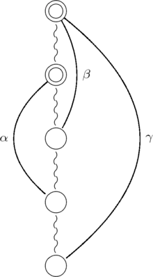 In the following figures, simple circle nodes represent vertices, double circle nodes represent subtrees, twisted segments represent tree paths, and curved arcs represent cotree edges. The root of each tree is shown at the bottom of the figure. In the first figure, the edges labeled and are T-alike, meaning that, at the endpoints nearest the root of the tree, they will both be on the same side of the tree in every planar drawing. In the next two figures, the edges with the same labels are T-opposite, meaning that they will be on different sides of the tree in every planar drawing.