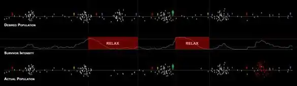 Overriding the procedural generation is the aim to create "active dynamic pacing" of the game by continuous monitoring of players, and altering the predetermined pacing to react to this.[28] Each player character is tracked by a metric called the Survivor Intensity, which increases as the character takes damage, becomes incapacitated, or another character dies nearby, among other effects, and slowly decays in time. The Director will alter its previously developed schedule for spawning of infected to build up Survivor Intensity to a certain threshold; when this occurs, the game sustains this peak for a few seconds, then enters a period where it relaxes and reduces the spawning of infected, allowing the players to finish their current encounter and allow their Survivor Intensities to fall away from the threshold. The Director then repeats this cycle until the players have reached the end of the level.[28]