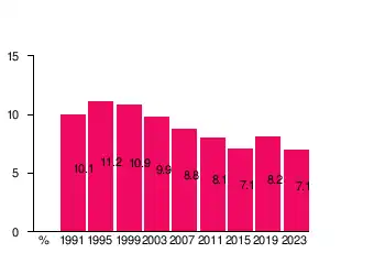 In the 2015 parliamentary election, the party received 211,615 votes, 7.1% of the total, and won 12 seats in the parliament.[17] In April 2016, Arhinmäki announced that he wouldn't seek another term as the party leader.[18] On 11 June 2016, Arhinmäki was succeeded by Li Andersson.[19] Under the leadership of Andersson, the party gained support in the 2017 municipal elections and the 2019 parliamentary election; in the latter, the party increased its representation in the parliament for the first time since 1995.[20][21]