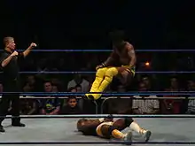 This variation of the leg drop sees the wrestler drop both legs onto the opponent, usually onto their midsection, instead of just one leg. It was used by Kofi Kingston, who calls it the Boom Drop.