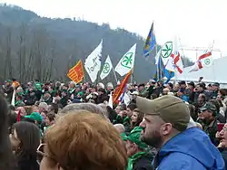 On 7 December, Salvini, endorsed by Maroni and most leading members (including Tosi, who had renounced a bid of his own), trounced Bossi with 82% of the vote in the "primary".[86] His election was ratified a week later by the party's federal congress in Turin.[87] Under Salvini, the party embraced a very critical view of the European Union,[88] especially of the Euro, which he described a "crime against mankind".[89] Ahead of the 2014 European Parliament election, Salvini started to cooperate with Marine Le Pen, leader of the French National Front; and Geert Wilders, leader of the Dutch Party for Freedom.[90][91][92] All this was criticised by Bossi, who re-called his left-wing roots;[93][94] and Tosi, who represented the party's centrist wing and defended the Euro.[95]