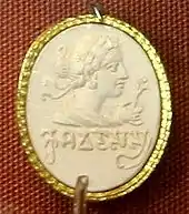 The "Kanishka casket", dated to the first year of Kanishka's reign in 127 CE, was signed by a Greek artist named Agesilas, who oversaw work at Kanishka's stupas (caitya), confirming the direct involvement of Greeks with Buddhist realizations at such a late date.[25][26][27][28][29]