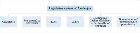 the Constitution, acts adopted by referendum, laws, orders, Resolutions of the Cabinet of Ministers of Azerbaijan, Normative Acts of central executive power bodies. International Treaties, of which Azerbaijan is a party, compose an essential part of the legislative system of the Azerbaijan.[2]