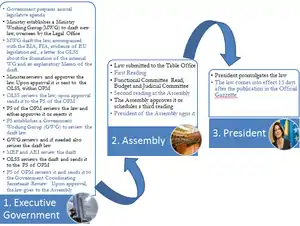 Laws most often originate at the Ministries, which are responsible for both drafting laws and amending new laws. Once the Minister approves the draft law, it is sent to the Prime Ministers Office and Office of Legal Support Services. OLSS is responsible for coordination and review of all draft laws drafted by the government. Once the OLSS reviews the law, a request is submitted to the Permanent Secretary of the PMO to establish a working group at the government level. After the government working group completes its review the, law is sent to the Ministry of Economy and Finance (MoEF) and Ministry for European Integration (MEI), before it will make its final rounds at the Assembly. The MOEF reviews the financial and budgetary implications of the law, while the MEI evaluates if the law is compatible with the EU legislation. Upon their approval of the law, the draft is sent to the PS of the PMO to be included on the agenda of the Government Coordinating Group for a final review. This is also the final step in the legal drafting process within the Government. Draft law is then forwarded to the Kosovo Assembly for their review.[8] The law is afterwards registered with the Table Office at the Assembly. After registration, the law undergoes a “first hearing.” After the hearing, the law is reviewed by the respective functional Committees, which propose amendments and send it back for the second reading. A law can go through three readings in the Assembly. After a law is approved by the Assembly it is sent to the President who can sign it or return it within 8 days to the Assembly for revision. The law comes into effect once it is signed, and promulgated by the President 15 days after the publication in the Official Gazette.[8]