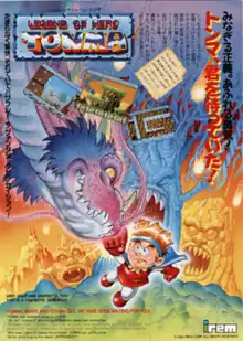 Legend of Hero Tonma (レジェンド・オブ・ヒーロー・トンマ) is a side scrolling platform game released by Irem to arcades in 1989. The player controls a caped hero named Tommy in his quest to rescue a princess. Tommy can cast fireballs (which can be upgraded in power) to dispatch enemies, and jump on their heads to temporarily stun them.