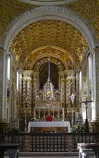 In 1377, because of the increased number of pilgrims, king Fernando had a church built near the chapel and transferred the statue there. At the end of the sixteenth century, this church experienced the first of a series of reconstructions and enlargements. The existing building is now the result of several interventions from the sixteenth to the nineteenth centuries that give it a very unusual character. This church or sanctuary is named Santuário de Nossa Senhora da Nazaré (Sanctuary of Our Lady of Nazaré).[1] The holy image is now on display in the main chapel in a small niche above the altar that can be accessed by a staircase leading from the sacristy. Since 711, the statue has remained in the village named after it: Sítio da Nazaré (Place of the Nazaré). In this village, nowadays, a quarter of the town of Nazaré, one can still visit the three sanctuaries mentioned above: the underground hermitage, the small chapel above it, and the church where one can visit Our Lady of Nazaré.