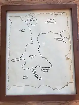 Leggets Lake (originally Leggett's Lake) was named for Mortimer Leggett (1837–1930) who came from New York and settled on a 140-acre farm in Clintonville, Michigan, next to the lake that would bear his family name.[3] The lake originally was separate from Lake Oakland and an effort to conjoin the two commenced in the late 1950s and concluded in 1960. Now part of Lake Oakland, the body of water is referred to as Leggett Bay. Grayson Canal was added to expand lake access to homeowners on Rutherford Court (formerly the Rutherford Estate) and Athens Avenue (formerly Meigs Fields property).[4]