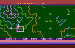 In the game, the player takes the side of the Romans, playing the role of Julius Caesar and giving orders to their forces in real time. The computer plays as generic barbarian tribes, in blue, with the player's legions in pink. There are three types of units: infantry is represented by a sword, cavalry by a horse head, and Caesar's own Imperial Guard by an eagle.[3] Orders are given to the units by moving a cursor over them with the joystick and then holding down the joystick button; existing commands are displayed as a moving arrow, and new orders can entered by pressing the joystick in the four cardinal directions.[3]