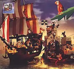 The Pirates were led by Captain Redbeard (called Captain Roger in some markets), distinguished by his black bicorne hat, left eye patch, peg leg on the right and a hook where his left hand was; his crew included First Mate Rummy and the young Bo'Sun Will. Another pirate leader was Captain Ironhook who has been suggested as a rival to Redbeard; both minifigures were similar except that Ironhook had a tattered shirt (some releases of Ironhook have a peg leg).[6] Their emblem was the Jolly Roger, a black flag featuring the skull and crossbones. 6285 Black Seas Barracuda was their first pirate ship while 6270 Forbidden Island was their original hideout, both released in 1989.[7] The catalogue releases for the Pirates expanded considerably with a larger base, 6273 Rock Island Refuge (1991), and then a pair of pirate ships in 1993 (the large 6286 Skull's Eye Schooner and small 6268 Renegade Runner).
