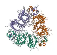 Legumin is similar to the casein of mammalian milk and was called "vegetable casein" since it was considered analogous to the mammalian protein.[1] The primary function of the legumin protein in seeds is storage. Legumin proteins are one of the main storage proteins of angiosperms and gymnosperms.[3] Legumin is an insoluble hexameric conjugated protein with a high concentration of carbon and oxygen.