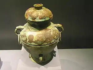 A lei (Chinese: 罍; pinyin: léi) is a large bronze wine jar used from the late Shang dynasty period to the Eastern Zhou dynasty period in ancient China, with a characteristic double-eared and narrow-necked shape. They come in square and round varieties, with the former used by the Shang, and the latter used by both the Shang and Zhou. Over time, the form of the lei gradually transitioned from thin, tall vessels to shorter jars. Within the Erligang culture, lei vessels were cast in the Central Plains and exported to the middle reaches of the Yangtze River.[1]