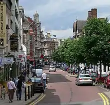 It is thought that the later medieval walls and gates were in approximately the same positions as the Roman ones, with the forum being where the modern inner ring road meets St Nicholas Circle. The Roman baths are nearby and are preserved at Jewry Wall.[1] The east gate was at the eastern end of High Street (preserved in the street name Eastgates), the north gate was at the northern end of Highcross Street, the west gate was on the town side of West Bridge, and the south gate was in the modern Friar Lane area – the city walls ran along the current Millstone Lane, Horsefair Street, Gallowtree Gate, Church Gate, Sanvey Gate and Soar Lane, with the western wall possibly running along the river Soar (there is some doubt as to whether the western wall existed). The city centre was the High Cross, at the junction of the current High Street and Highcross Street (in mediaeval times, High Street ran between the north and south gates along the line of the current Highcross Street, while the current High Street was called Swinesmarket). Leicester Cathedral[2] and the Guildhall occupy this old area of town.