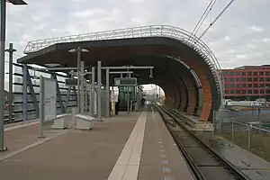 Leidschenveen is the RandstadRail station in the centre of Leidschenveen in the neighbourhood Leidschenveen-Ypenburg in The Hague, Netherlands. The station features 2 platforms on a viaduct. These have a high and a low platform, with tram lines RandstadRail 3 and RandstadRail 4 using the lower platforms, and metro line E using the higher platforms. Leidschenveen is the station where the metro and the tram lines split, with the metro (line E) continuing to Rotterdam, while the trams (3 & 4) continue to Zoetermeer. The RandstadRail station opened on 29 October 2006 for the HTM tram services (4) and for the RET metro service (line E), and on 20 October 2007 for tram service 3.