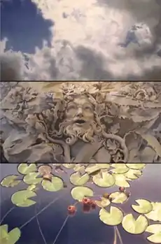 From the 1990s onward, iconography and narrative play an increasing role in Behnke's work, triggering senses of collective history, the past, and time in the dialogue between imagery; she has expanded its scope to include cosmological and natural phenomena, universal forms, and scientific theory.[46][10][3] The images of her stacked, three-panel works, Sidereus Nuncius (1990), Interregnum (1995) and Blind Sight (1996), navigate and contrast varying rhythms, elements (land, water, air, light) and perspectives, progressing bottom to top from microcosm (fish, flowers, grass) to the human environment to macrocosm (the stars); such work often invokes scientific investigation and exploration: Sidereus Nuncius ("Starry Messenger") was an early astronomical book by Galileo Galilei, Wallace's Heresy references natural selection theorist Russel Wallace), and "blind sight" refers to pre-modern navigation methods.[3][2][10] In the architectural triptychs, Archimedes's Dream (1998) and The Paradox of Infinite Regression (1999, above), Behnke explored complex, patterned spatial and geometric relationships and the mathematical form of the spiral or nautilus; critic Hilton Kramer called the latter work "a virtuosic pastiche of Futurism, Cubism and Realism executed with consummate skill."[30][8]