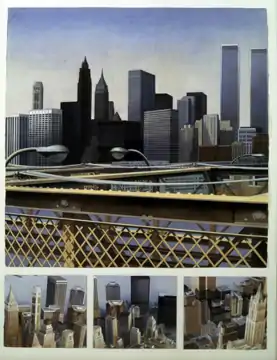 Behnke's cityscapes used these formats in a similar manner, bringing disparate viewpoints (bird's-eye, low-angle), dramatic changes in scale, and tightly cropped fragments into dialogue with one another; critics Grace Glueck and Gerrit Henry wrote that the composite works expressed "the dynamics of New York City life"[42] and a "questioning aesthetic love."[43][12][17] Works such as Brooklyn Bridge Compositional Study (2nd Version) (1983), Bridge Promenade (1991), Wallace's Heresy and Broken Symmetry (both 1990), often reduced buildings to geometric forms and colliding rhythms, generating visual tension through compressed, activated space.[23][16][2][44] In her presentation of multiple perspectives, Behnke portrayed urban experience as visually complex—continuous, fragmented, dislocated, monumental and transient—and ambiguous in its effects: awe, pleasure, progress, disorientation, claustrophobia.[7][2][17][45][29]