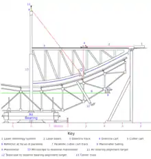 A unique feature of the Leighton telescopes is that the primary is fabricated as a single 10.4 m diameter precision surface, rather than individually machined panels. The dish panels are made of a light weight (15 kg/m3) aluminum honeycomb material with vertical channels. To produce the reflector's parabolic shape, the panels were assembled atop the same steel tube space frame that will support the panels on the deployed telescope. The space frame was mounted on an air bearing surrounding a central mast. An arm extended from the central mast, which had a parabolic track on the bottom side. The parabolic track was shaped by a laser metrology system that made use of the fact that a parabola is the locus of points equidistant from the focal point and a directrix line. The directrix in this case was the upper side of the arm. After the parabolic track was created, a cutting tool moved along the track, and cut the honeycomb panels as the dish rotated on the air bearing. After the honeycomb panels were cut to the proper parabolic shape, an aluminum skin was applied to each panel, to provide the dish's reflecting surface.[5]
