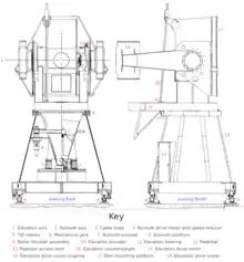 The telescopes have an altazimuth fork mount. The azimuth axis is an inverted circular cone, the apex of which is supported by a thrust bearing. Cam-follower roller bearings mounted around the top of the base push against the top of the inverted cone to complete the azimuth axis constraint. There is a cable wrap for signal and power wiring which rides atop the azimuth thrust bearing. On the top of the cone is the azimuth platform, which supports two elevation bearings. The elevation tipping platform that supports the primary reflector is driven in elevation by a rotating ball-screw.
