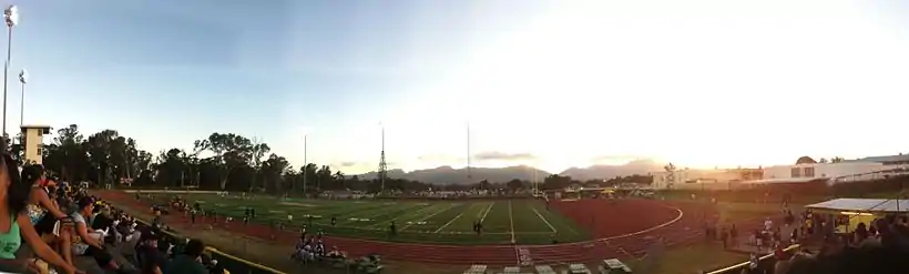 Leilehua High School is a public, co-educational, college preparatory high school in Wahiawa, Hawaii on the island of Oʻahu.[2] It is part of the Hawaii State Department of Education, nationally recognized as a Blue Ribbon School by the United States Department of Education, and fully accredited by the Western Association of Schools and Colleges (WASC). The school was first established in 1924,[3] when Hawaii was still a territory and located close to present day Schofield Barracks. The graduating class of 1928 totaled 15 students, all dependents of military personnel. It relocated to its present 32-acre (130,000 m2) campus in the historic town of Wahiawa in 1949. The layout of the Leilehua facility was designed to represent openness, tranquility, and harmony with the environment. Buildings of an older vintage are blended among an abundance of trees and greenery. The campus boasts sculptures by Satoru Abe, Bumpei Akaji, Claude Horan, Rick Mills, Jacob Sakaguchi, and Ken Shutt.