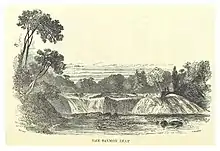 The River Liffey, flowing from west to east, forms the southern boundary of the parish. From the north-western corner of the parish, the Rye Water flows in a south-easterly direction until its confluence with the Liffey at the western edge of the village's Main Street.[6] Near Louisa Bridge railway station, the Rye Water receives water from the Leixlip Spa. It also receives an overflow from the Royal Canal. The Rye then flows under the canal, which is carried in the Leixlip aqueduct almost 100 feet (30m) above. The aqueduct, an earth embankment, took six years to construct in the 1790s.[7] Before entering the village, in the 18th and 19th centuries the river powered some mills. In 1758, the site was used as a linen printing mill.[8] Later it powered the Rye Vale Distillery which produced more than 20,000 gallons of whiskey in 1837.[9]