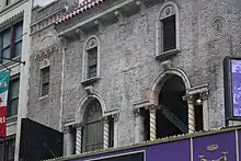 The facade consists of two sections. The three-story-tall eastern section is wider and is symmetrical, containing the auditorium entrance. It is made of yellow-beige brick with white terracotta decorations.[14][15] The western section, which contains the stage house, is four stories high and contains a brick facade.[16] The third story of the auditorium is on an intermediate level between the third and fourth stories of the stage house.[15]