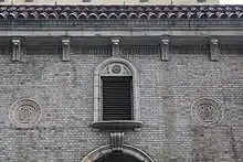 On the upper stories, the auditorium is arranged into three sections from left to right. The auditorium's outermost openings, on the second and third stories, have a single six-over-six sash window on either story. Lunettes with rosettes are placed above each of these windows. These windows are surrounded by a brick band, which is laid in a pattern resembling an arch. At the top of this arch is a molding with corbels, as well as a brick panel with bond work in a basket-weave pattern. Above this are terracotta friezes with fleur-de-lis and rosette patterns, topped by a brick parapet.[17]