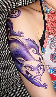A corporate commission in 1993 began Mace's connection with Japan.[21] He was hired to draw the five-story pagoda of Tō-ji temple in Kyoto photorealistically in ballpoint pen. The trip to Japan to draw it on-site was considered partial payment.[30][31] During his earliest time in Japan, he gained notoriety in Tokyo nightclubs applying ballpoint drawings onto customers’ clothing and flesh for free drinks (pictured), which led to legitimate work, including temporary tattoos for music videos, film clients, and fashion events.[27][32][33] Illustration work for expat publications helped introduce Mace to the international community in Tokyo.[27] Portraiture soon became a standard element of the artist's output in Japan, rendering people and pets in ballpoint pen by commission.[4][3] Exhibitions in Japan include regular showings at Isetan Department Store. Most have occurred in the flagship Shinjuku store in Tokyo, but have also been held at other branches around Japan.[27][34] The artist continues to maintain a presence in Tokyo via exhibitions and collaborations.