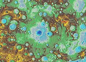 The northern part of the basin is within the Derain quadrangle and the southern part is within the Debussy quadrangle.