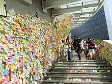 It was a space of encouragement and solidarity, full of colourful Post-It notes (more than ten thousand pieces) with messages advocating for freedom, democracy and universal suffrage. Post types included epigrams, lyrics, poems, foreign words and hand-drawn graphics. During the 2014 Umbrella Movement protests, there were coordinated preservation efforts to digitally document the wall and related protest art.[2][3][4]