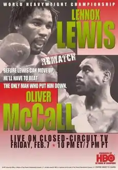Lewis and McCall had previously fought each other two and a half years earlier. At the time, Lewis was the undefeated WBC Heavyweight Champion and had successfully defended his title three times before being challenged by the virtually unknown number one contender Oliver McCall. After a close first round, McCall was able to catch Lewis with a short right hand that dropped Lewis to the canvas. Lewis was able to get back up, but was on wobbly knees. Deciding Lewis could not continue, referee Jose Guadalupe Garcia stopped the fight and awarded the victory to McCall by way of second round technical knockout.[1] Lewis called McCall's victory "lucky" and offered $10 million for a rematch, but McCall refused the offer claiming that Lewis had disrespected him with his post-fight comments and instead chose to make the first defense of his newly won title against 45–year old ex-heavyweight champ Larry Holmes.[2] As a result, Lewis was forced to go down the comeback trail, defeating two little-known journeymen before facing former WBO Heavyweight Champions Tommy Morrison and Ray Mercer, defeating them by technical knockout and majority decision respectively.