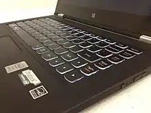 The Yoga 2 Pro is an Ultrabook-class device. It weighs 3.1 lb (1.4 kg), is 0.61 inch thick and has tapered edges, giving it an appearance more like a conventional ultrabook laptop vs the earlier model's "book-like" symmetrical design. The Yoga 2 Pro features a 360-Degree Flip-and-Fold design that encompasses four modes—laptop, stand, tablet, and tent mode and has a subtle rubber trim around the edge of its top half in order to prevent slipping on hard surfaces when in tent mode. It comes with a backlit AccuType keyboard and features stereo speakers with Dolby Home Theater. Unlike earlier Yoga products, the home button is now a touch-key on the bottom center of the display. Lenovo moved the power button away from the front and to the side in order to prevent accidental key presses.[1][2]