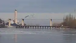 The Leo Frigo Memorial Bridge is a bridge on the north side of Green Bay, Wisconsin. It carries Interstate 43 over the Fox River just south of its mouth into Green Bay. Formerly known as the Tower Drive Bridge, it was renamed in 2002[3] "in recognition and appreciation of Leo Frigo,[4] a civic and philanthropic leader in the Green Bay area.[3] The bridge opened to traffic in 1981.[5] Because of the bridge's height and slope, it is prone to being shut down during inclement weather. The bridge carries roughly 40,000 vehicles per day as of 2015.[6]
