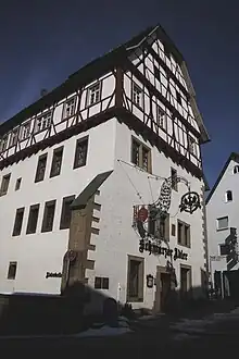 The only surviving building from the old town fortifications was the "Stonehouse" near the uppermost tower, probably because it was the only one used for housing and was not destroyed by the great fire of 1498. Today, it has become the Schwarzer Adler guesthouse and is a defining feature of the old town. According to an analysis carried out in 1999,[4] the wooden-timber gabled roof on top of the Schwarzer Adler was built in the 15th century. Three stories high, it is one of the largest and oldest original timber-gable roofs in southern Germany.