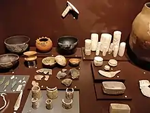 The late Palaeolithic period is represented by stone tools that were found mainly in the sand dunes at Santa Cruz and Cambelas in the Torres Vedras municipality. A major Mesolithic site in Portugal is also located in the municipality, in the dunes at Ponta da Vigia. Numerous Neolithic and Chalcolithic sites have provided items for the museum’s collection, particularly domed tombs. Vessels of the Bell Beaker culture from around 2800 BC are also well represented. Noteworthy are items from the Mesolithic necropolis of Cabeço da Arruda, located south of Santarém in Portugal, as well as various Phoenician items from the Iron Age from around 700 BC, giving rise to the belief that an Iron Age settlement existed in Torres Vedras that had trade contacts with the Phoenicians. In the Roman section, in addition to remains of ceramics, mosaics, jewellery and metal objects from Roman villas in the area, there are also a number of inscribed stones. From the early Middle Ages comes the museum’s collection of tombstones. [1]