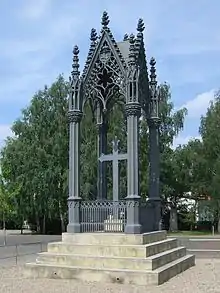 Leopold fell at the head of the Prussian Guard at Großgörschen – his adjutant Ernst August Moritz von Froelich heard his last words as "Don't leave me under the French!". Von Froelich recovered his body and got it back to Leopold's sister Marianne.[3] She erected a simple iron monument to him, whose inscription translates as "Here lies Prince Leopold of Hesse-Homburg. [Killed] 2 May 1813". She also set up a monument near the battle site, known as the Hesse-Homburg Monument.[4] The street of Leopoldsweg in Bad Homburg is named after him, whilst the Gothic House there held an exhibition on the bicentenary of his death from 1 May to 28 August 2013.[5][6]