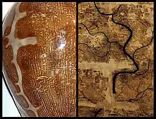 The map cowry was named on the basis of its distinct color pattern, because of the longitudinal lines and the easily distinguishable and sinuous mantle groove, which creates a resemblance to ancient maps.[3]