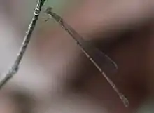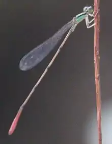 Leptobasis lucifer, commonly referred to as lucifer swampdamsel, is a relatively long and slender species of narrow-winged damselfly in the genus Leptobasis found in Central America, southern parts of Mexico, as well as locally in Southern Florida.[1] L. lucifer prefers swampy woodland habitats, such as cypress swamps and tend to hunt near trees, scanning and hovering around leaves in search for prey.[1] Males have black striping on a green thorax with a bright red patch near the end of the abdomen,[1] whereas females are more variable: ranging from dull greenish brown, to blue and reddish orange, to even green with a blue ring around the abdomen. Adult females of this species have a large ovipositor and immatures of both sexes have pale blueish in replacement for any green or greenish patches that would be visible in the adult stage.[1]