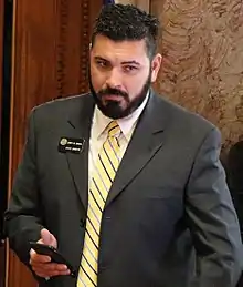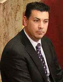 He was selected to serve as the assistant minority leader on November 10, 2016.[20] Senator Lucía Guzmán resigned as Minority Leader, stating that she could not work with the Republican leadership in the state senate on sexual harassment issues, and Garcia was selected to replace her, with Senator Rhonda Fields being the only vote against him, while Guzmán was selected to replace him as assistant minority leader.[21] He was selected to serve as president of the state senate on November 8, 2018, becoming the first Hispanic person to hold the position, and reelected to the position in 2020.[22][23][24] Garcia announced on February 3, 2022, that he would resign from the state senate, with his resignation taking effect on February 23, to become special assistant to the Assistant Secretary of the Navy for Manpower and Reserve Affairs.[25] Steve Fenberg was selected to succeed him on February 22.[26]