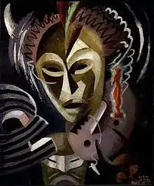 The painting comprises five different African masks painted in the style of modernism. A red religious fetish is also in the foreground. The masks and fetish appear to float in the mass of a black painted canvas.[1]