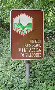 Sign outside Thon-Samson describing it as "One of the Most Beautiful Villages of Wallonia"