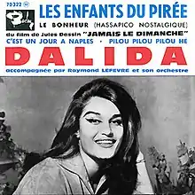 "Les enfants du Pirée" ("Children of Piraeus") is a French song by singer Dalida, first released on EP in June 1960. It was a big international summer hit and remained one of major successes of her career. The song comes from the Greek movie "Never on Sunday/Pote tin Kyriaki" nominated for 8 Oscars and won an Oscar for the music of Manos Hadjidakis, sung by Melina Mercouri who starred in the movie along Jules Dassin.