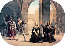 An Italian libretto was quickly prepared under Verdi's supervision by the poet Ettore Caimi. The composer was aware that in Italy at that time, it would have been impossible to place the story in Sicily, as he notes to his publisher Giulio Ricordi in April 1855: "I shall ... (change) the subject so as to render it acceptable for Italian theatres".[20] Based on Scribe's suggestions for changing the location - "I suggested that the Duke of Alba should just pack his bags once more and move to Lisbon"[21] - it became Portugal in 1640 while under Spanish control. Therefore, the title was changed to Giovanna de Guzman. Overall, Verdi was not happy with the translation, which Budden regards as "one of the worst ever perpetrated.[22] However, some improvements were made when the opera reverted to its translated Italian title after 1861.