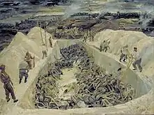 Clark and the WAAC committee were impressed with the unflinching way Cole had dealt, in his pictures, with the violence he had witnessed in Greece and assigned him to record the aftermath of the liberation of the Bergen-Belsen concentration camp.[6] In the camp, Cole produced three large, panoramic oil paintings of survivors, British troops and captured German guards.[5][7]