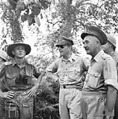 In late September 1943, Morshead was summoned to New Guinea to relieve Herring by Lieutenant General Sir Iven Mackay, the commander of New Guinea Force, which he did on 7 October 1943.[69] Morshead found a difficult situation. The Japanese not only held the high ground overlooking the Australian beachhead at Finschhafen, they were rapidly reinforcing their position and were about to mount a major counter-attack. Morshead demanded and got critical reinforcements, including Matilda tanks of the 1st Tank Battalion. The Japanese counter-attack was crushed.[70] Morshead relieved Brigadier Bernard Evans of command of the 24th Infantry Brigade, replacing him with Brigadier Selwyn Porter, who had commanded a brigade in the Kokoda Track campaign. Unlike most reliefs of senior officers in SWPA this relief, while controversial at the time, has attracted little attention since.[71]