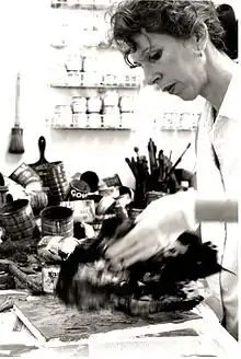 Wayne moved to Paris and lived there from 1974 to 1975, where she attended French classes at the Alliance Française, and continued to paint on her own and in various small ateliers. At the Alliance Française, Wayne met an Israeli man, with whom she developed a relationship. After having returned to California, she moved to Israel in 1975 to live with him and stayed there until 1980. In Israel, she continued to paint and explore other creative outlets, including ceramics and children's book illustration.[4] Wayne returned to Southern California in 1980 and two years later moved to New York City, where she enrolled in Parsons School of Design. At Parsons, Wayne became a sculpture major and studied with Ronald Bladen and Don Porcaro, whom she later married in 1987. She graduated with honors, with a BFA in sculpture in 1984.[4]